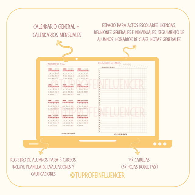 Esta agenda fue pensada para acompañar al/la docente durante todo el ciclo lectivo, facilitando la organización diaria, el seguimiento de cursos y el registro claro de la información escolar más importante.